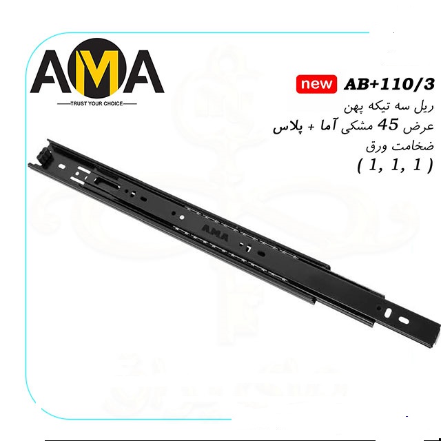 اگر به دنبال ریل ساچمهای مقاوم، روان و بادوام هستید، مدل ریل سه تیکه ساچمهای ۴۵ میلیمتر مشکی آما انتخابی ایدهآل است. این ریل برای کشوهای خانگی، دربهای ریلی و حتی پروژههای صنعتی طراحی شده و با کیفیت ساخت بالا، عملکردی ماندگار و قابل اعتماد را تضمین میکند.